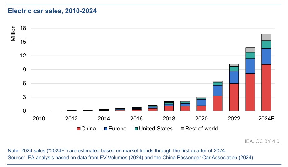Notably, global sales data for electric cars continue to exhibit strength. During the initial quarter of 2024, electric vehicle sales surged by approximately 25% in comparison to the corresponding period in 2023, mirroring the consistent year-on-year growth observed in 2022.