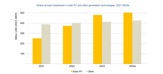Solar PV: The cornerstone of renewables — Solar PV will attract over $500 billion in investments in 2024, making it the leading power generation technology worldwide. Declining costs, coupled with policy incentives, have accelerated solar adoption. In India, for example, solar has achieved grid parity with coal, while the U.S. IRA has revitalized domestic solar manufacturing.
