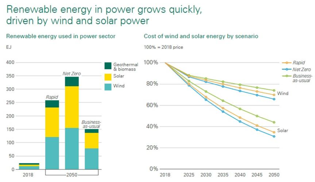 The report states that the fast pace of growth will ease slightly from the 2030s onwards as the costs of balancing the intermittency associated with adding increasing amounts of wind and solar power rise. Even so, the share of renewables in primary energy grows from around 5% in 2018 to around 45% in 2050 in Rapid and 60% in Net-Zero.