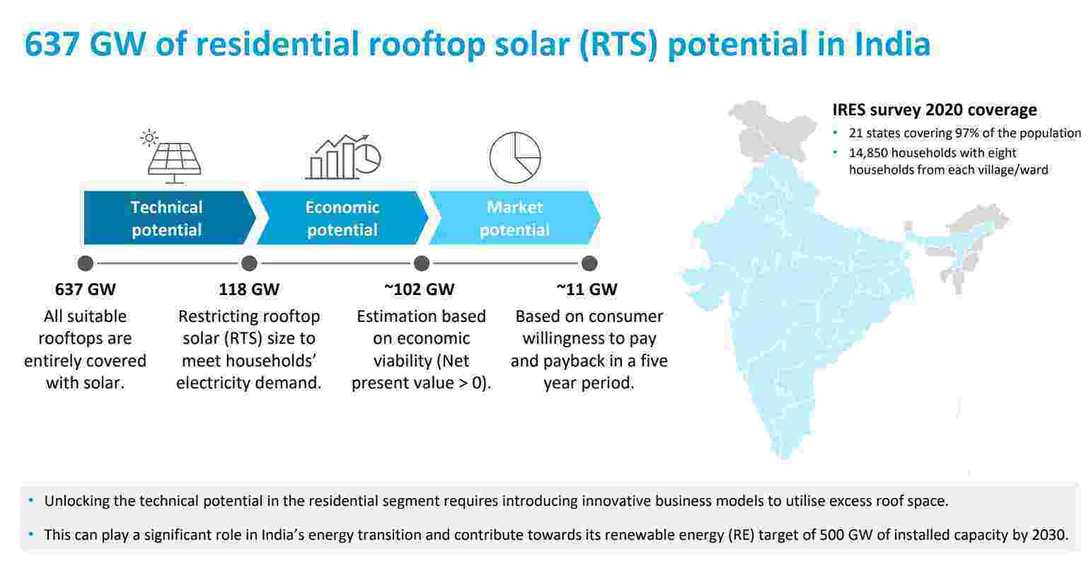 A study conducted by CEEW (Council on Energy, Environment and Water) indicates that there is a capacity of installing 637 GW of Solar Photovoltaic (PV) on the roofs of buildings. Tapping one-third of this potential could meet the total electricity demand of the Indian residential sector which is almost equal to 310 TWh.