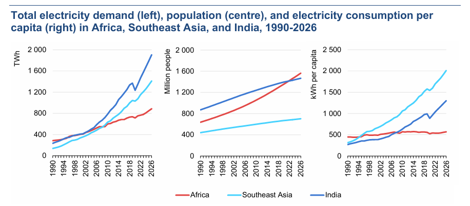 - India’s Speed: India is growing even faster, with annual demand set to rise by 6.5% through 2026. This rapid increase is driven by rising living standards, greater access to electricity, and increasing use of cooling systems. By the end of the decade, India will add demand equivalent to the current electricity consumption of the United Kingdom.
