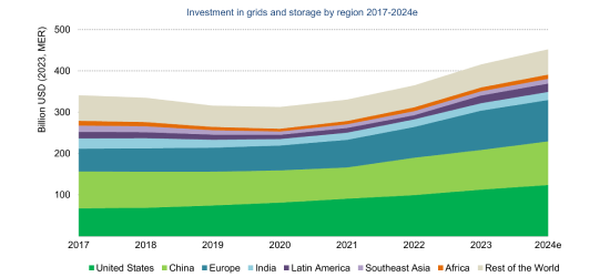Battery storage: Enabling Intermittent Renewables — Investments in battery storage are set to exceed $50 billion in 2024, reflecting its critical role in supporting grid stability and renewable integration. However, spending is concentrated in advanced economies and China. In EMDEs, investment in storage technologies remains minimal, underscoring the need for targeted financial and technical support.