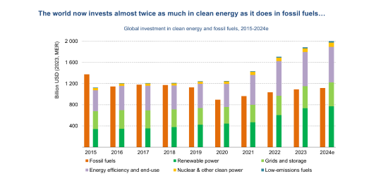Several factors underpin this transformation. The cost of solar panels has declined by 30% over the past two years, while the prices of critical minerals for batteries have stabilized following the spikes witnessed during the pandemic. Policy support has also played a pivotal role, with initiatives like the U.S. Inflation Reduction Act (IRA) and Europe’s Green Deal catalyzing investments and making renewables more financially attractive. Additionally, the war in Ukraine and disruptions to global supply chains have heightened the need for energy security, driving nations to prioritize self-reliant and sustainable energy systems. Despite these advances, global fossil fuel investment will still reach $1 trillion in 2024, reflecting ongoing demand and the complexities of transitioning away from entrenched systems.